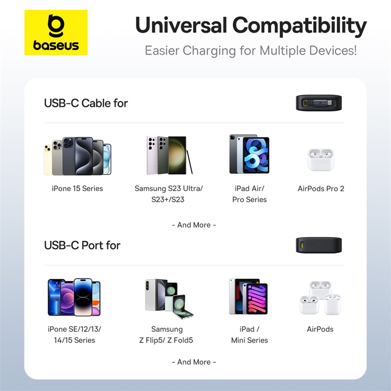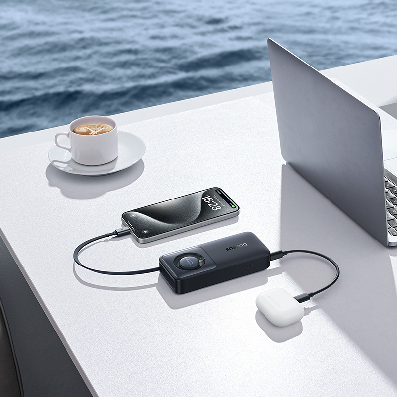 Dual Device Charging: Equipped with both a USB-C port and the built-in USB-C cable, enabling simultaneous charging of two devices.