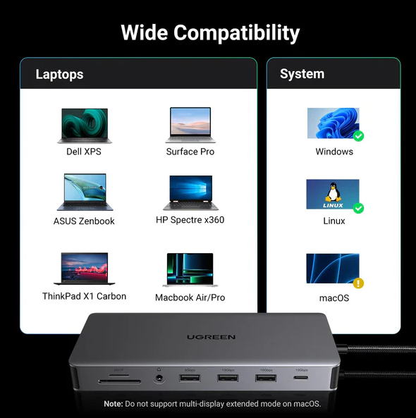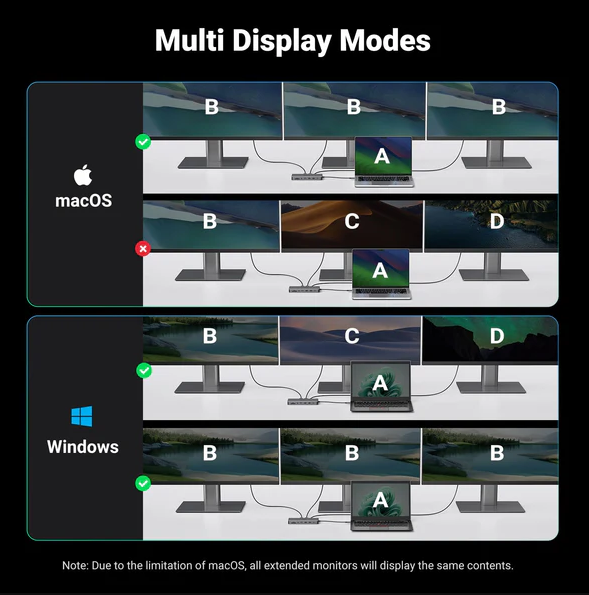 - Triple-Monitor Display: Support up to 4K triple-screen display. Support single and dual-monitor displays up to 4K@60Hz (Note: MacBooks only support mirroring mode)