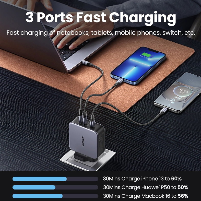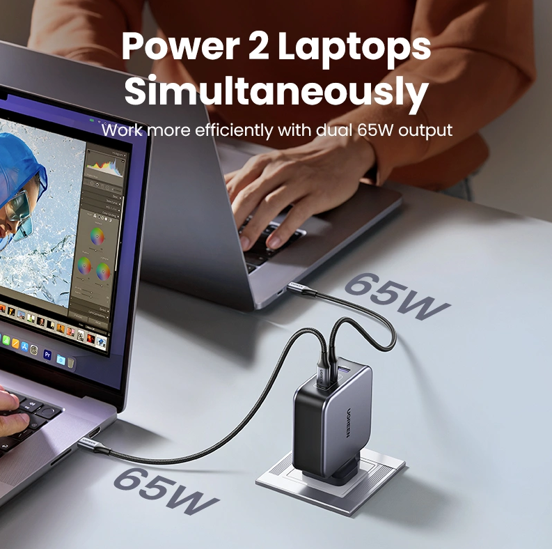 Supports simultaneous charging of two laptops and one smartphone with its two USB-C ports and one USB-A port, optimizing charging efficiency for all your devices.