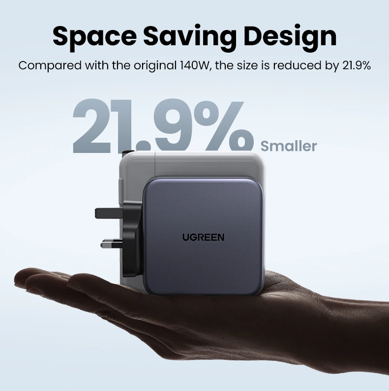 Powered by GaN technology, the charger is 22% smaller than traditional 140W chargers, offering portability without compromising performance.