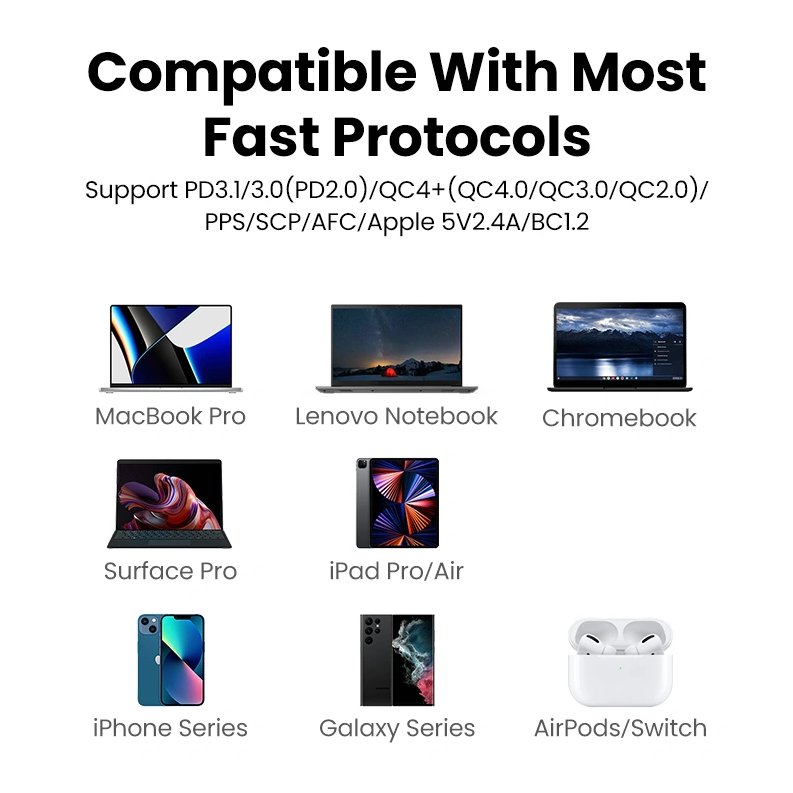 Smartphones: Samsung Galaxy S23 series (supports 45W super-fast charge 2.0), iPhone 15/14/13 series, Google Pixel series.