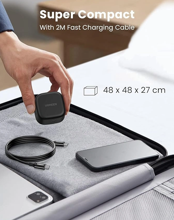 The charger comes bundled with a 2-meter USB-C to USB-C cable, offering additional length for more flexibility and convenience when charging. This cable is durable and supports high-speed data transfer and power delivery, enhancing the overall charging experience.