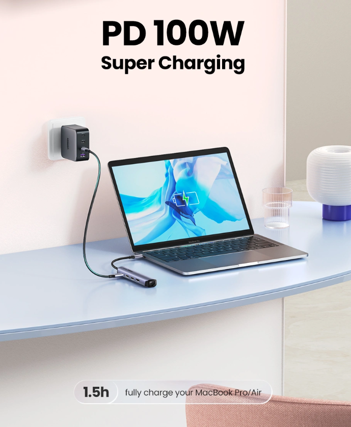 Equipped with a 100W PD power supply port, allowing simultaneous charging of connected devices while using the hub.