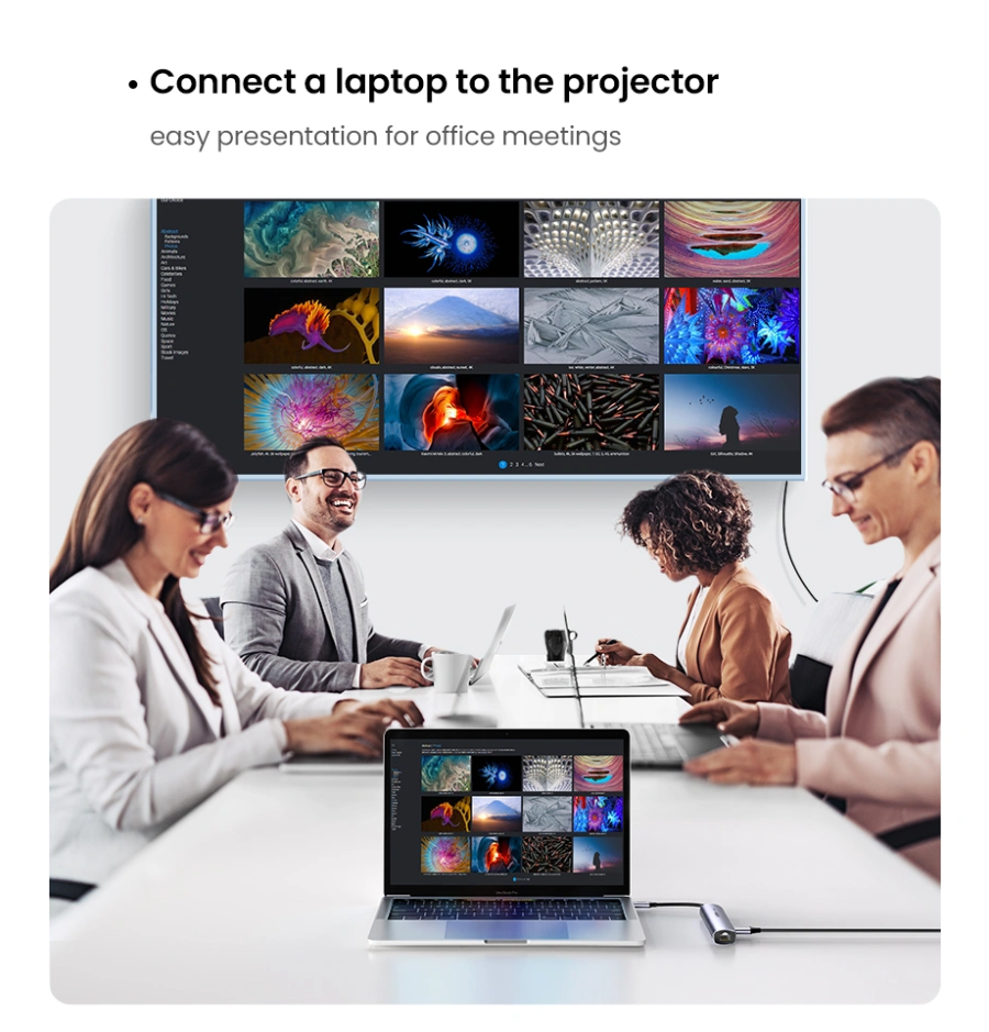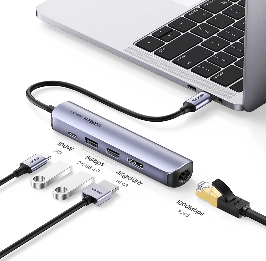 Expands your USB-C port into 2 USB-A 3.0 ports, 1 HDMI port, 1 RJ45 Gigabit Ethernet port, and 1 PD power supply port.