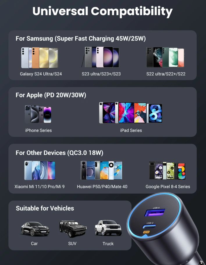Supports PD3.0, QC3.0, PPS, and Samsung 45W Fast Charging, making it compatible with various devices, including:
